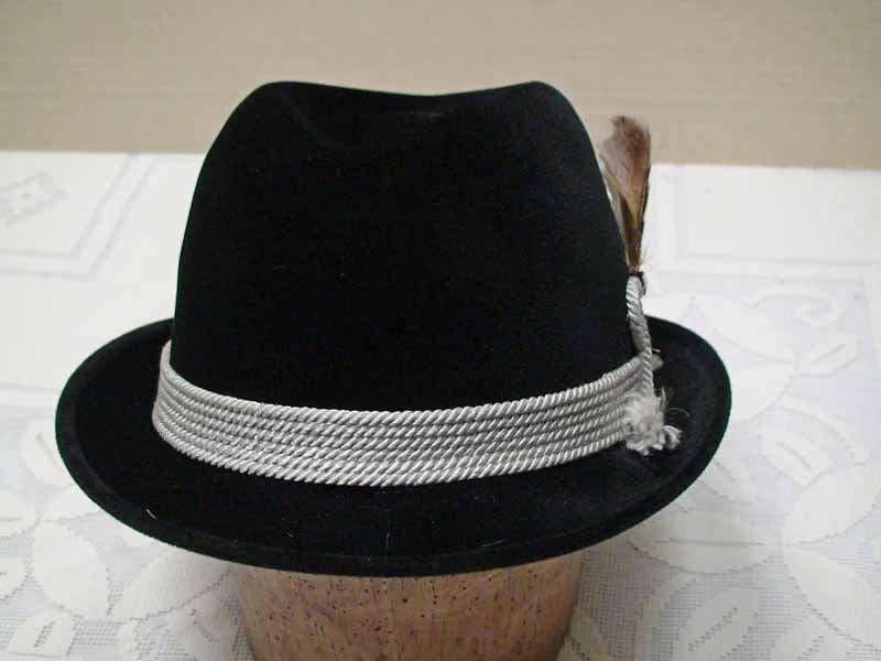 Black velour Tyrolean fedora with white cord band and horsehair and feather brush with silver flying goose ornament, circa 1963