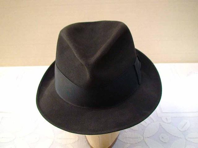 Gunmetal gray felt 1950s fedora with teardrop crease and wide gray grosgrain hat band.