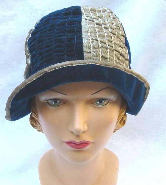 1920’s cloche quilted silver and blue velvet with big safety pin decoration.
