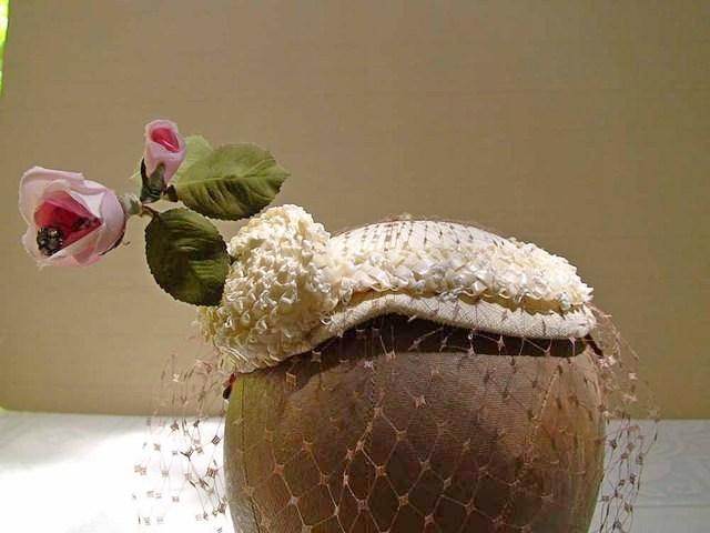 Ecru straw oval half-hat with silk rosebuds, rhinestone stem for stamen and veil
