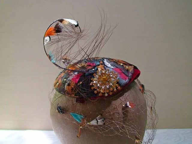 Multi-colored allover feather button with curled burnt feather plume and large gold rhinestone pin. Plume and veil are decorated with feather cutouts.