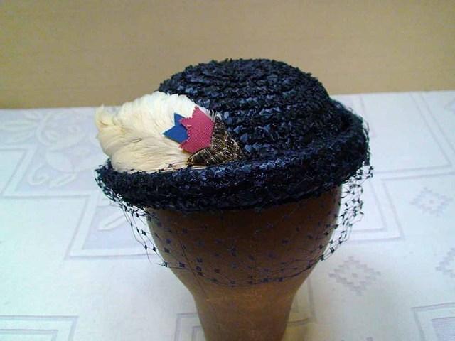 Navy straw shallow bowler with white feather wing and feather, ribbon and metallic embroidered arrowhead ornament