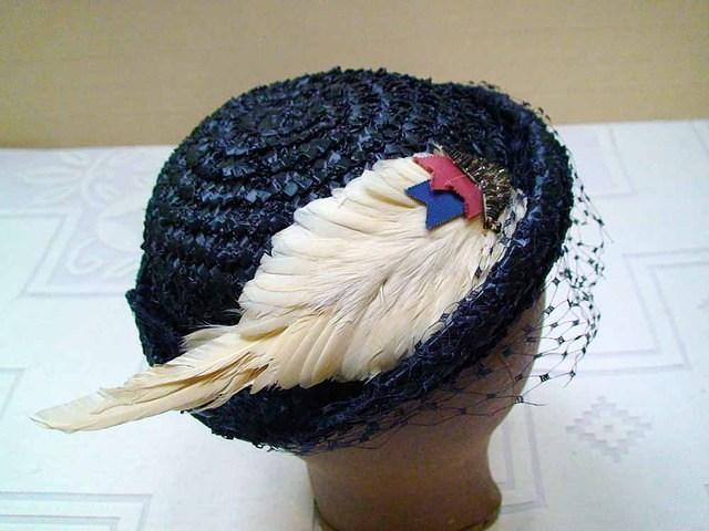 Navy straw shallow bowler with white feather wing and feather, ribbon and metallic embroidered arrowhead ornament