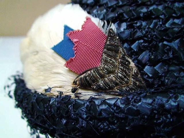 Navy straw shallow bowler with white feather wing and feather, ribbon and metallic embroidered arrowhead ornament