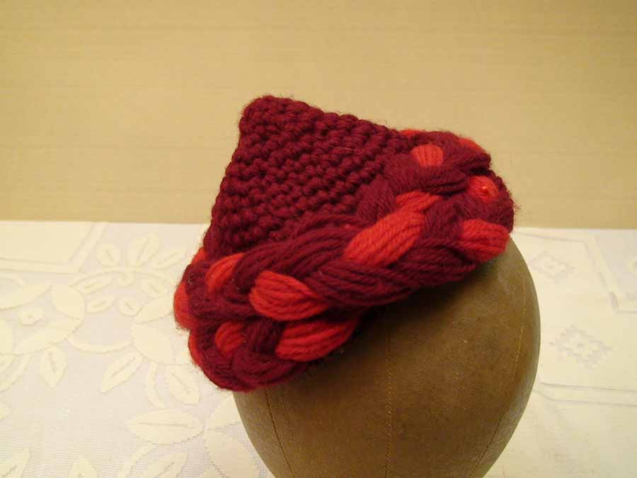 Burgundy and red crocheted wool pixie or Phrygian toque. It is small like a pixie hat, and perches with the aid of combs, but it has a tip that curves over to the side, like a Phrygian toque.