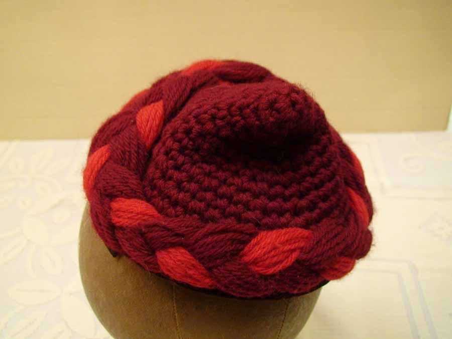 Burgundy and red crocheted wool pixie or Phrygian toque. It is small like a pixie hat, and perches with the aid of combs, but it has a tip that curves over to the side, like a Phrygian toque.