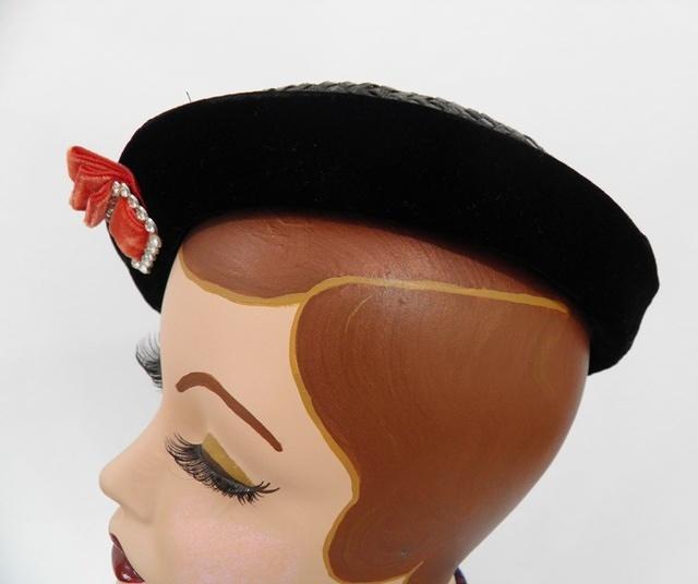 Black straw shallow crowned toque. Crown is encircled with black velvet band. Accented with red velvet and rhinestones.