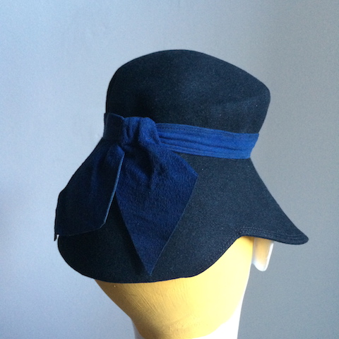 Black felt tilt doll hat with royal blue suede trim