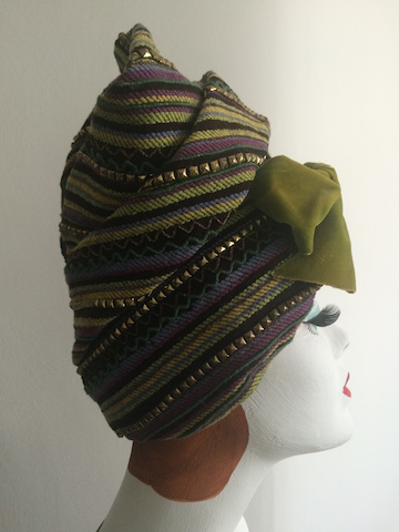 Tall turban with silk velvet bow to front, in heavy striped fabric embellished with rows of embossed brass diamonds. Featured in an article 'Big Fall Hats' in Life Magazine, August 6 1945, in which several milliners were invited to pick out their most important hat of the season. Lilly Daché chose this 'spiralling fez turban' as hers.