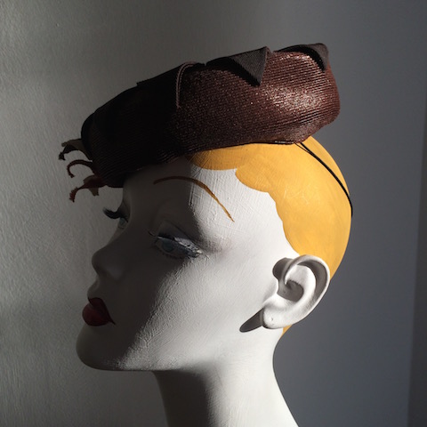 Brown lacquered straw pillbox with concave crown. Brown grosgrain triangles like petals all around, with cream and orange grosgrain detail.