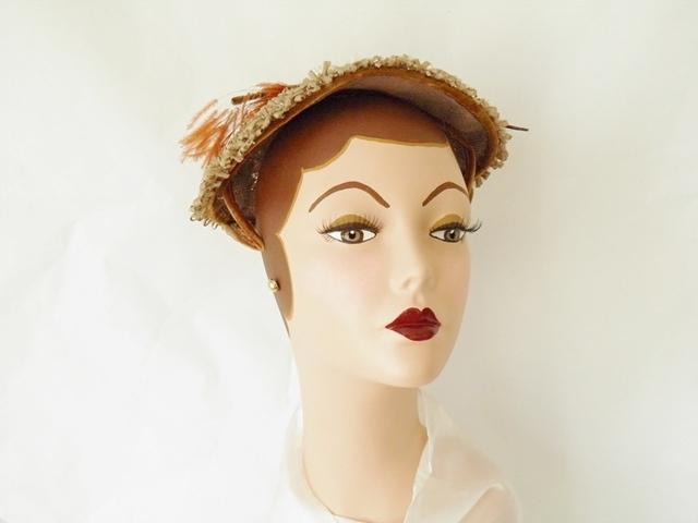Light brown and iridescent straw woven together to form a pagoda hat. Accented with an orange feather which has rhinestones for additional sparkle.