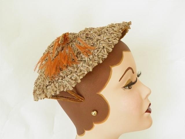 Light brown and iridescent straw woven together to form a pagoda hat. Accented with an orange feather which has rhinestones for additional sparkle.