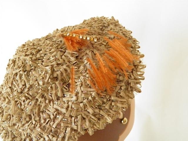 Light brown and iridescent straw woven together to form a pagoda hat. Accented with an orange feather which has rhinestones for additional sparkle.