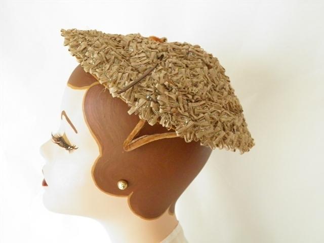 Light brown and iridescent straw woven together to form a pagoda hat. Accented with an orange feather which has rhinestones for additional sparkle.
