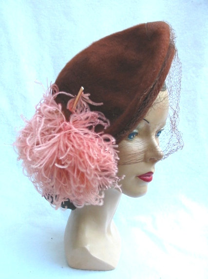 Late 40's French beauty. It is made of a rust color fuzzy fur felt. Lush ostrich feathers dip to one side and down the back.