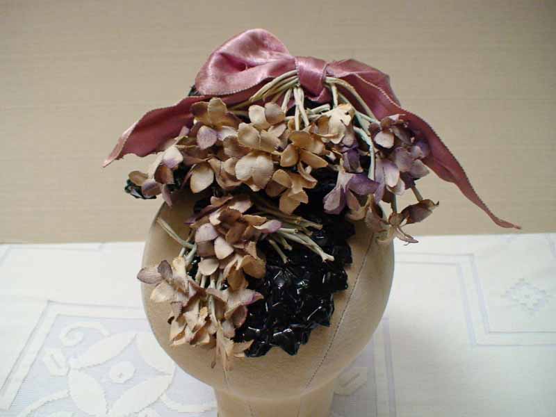 Navy cellophane braid bowler tilt with rose satin ribbon and beige and pink cloth flowers dangling on the left side of the cellophane straw "tilt kickstand" (a term invented by a contemporary milliner).
