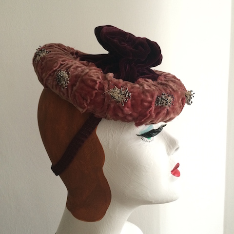Dusky pink and maroon silk velvet escoffion tilt. Dusky pink flowers, each with a cluster of stamens, surround the padded escoffion.