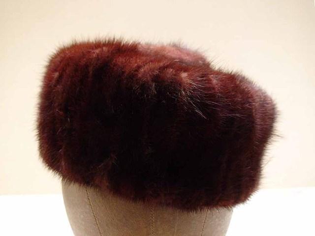 Auburn mink square pillbox with black fabric top and square center mink pompom.