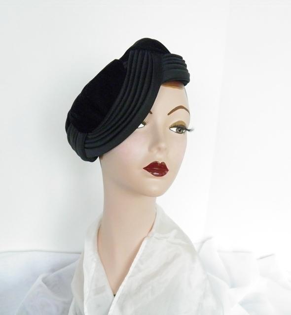 1960s black velvet and satin asymmetrical toque