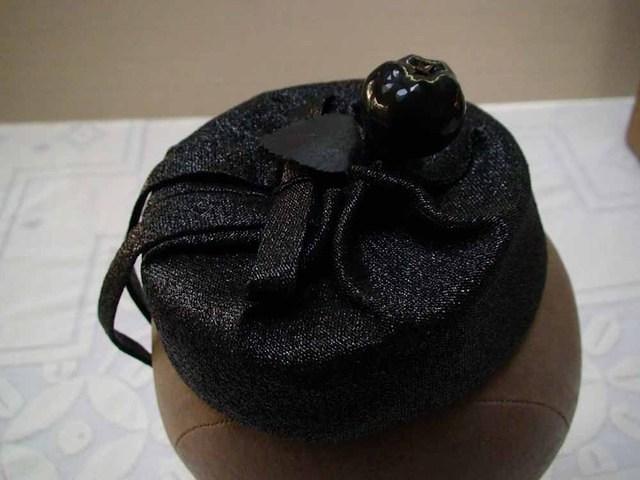 Black metallic fabric doll hat pillbox with black fruit and leaf and lappets in back.