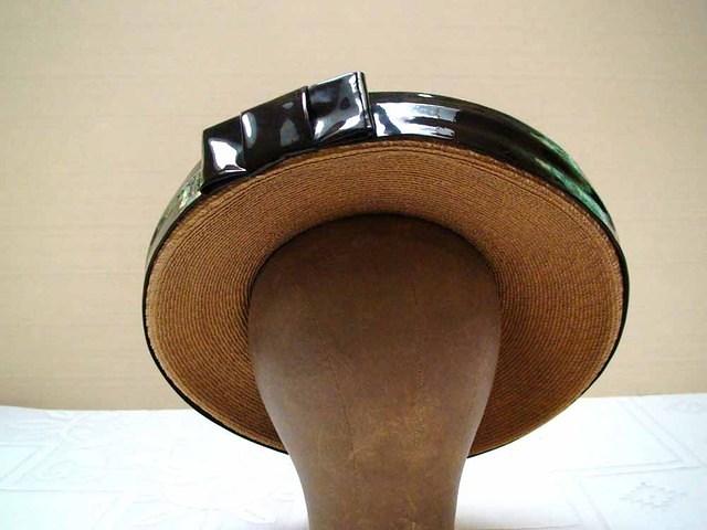 Tan straw angular Breton with black patent leather hat band and outer brim with bow