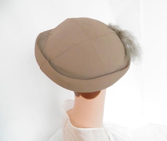 Taupe beret tilt hat with poof of downy feathers