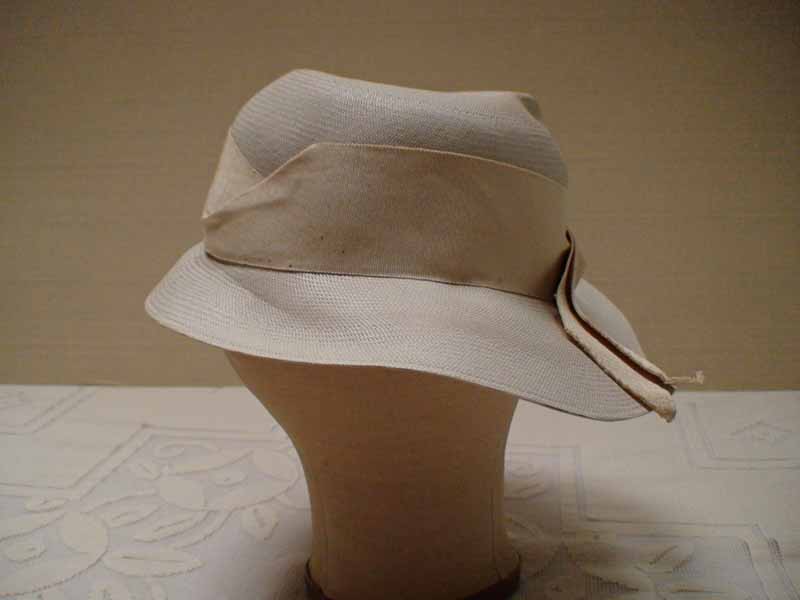 Beautiful creamy fine straw slouch with two pinches, asymmetrical brim and wide grosgrain band that ties in front.