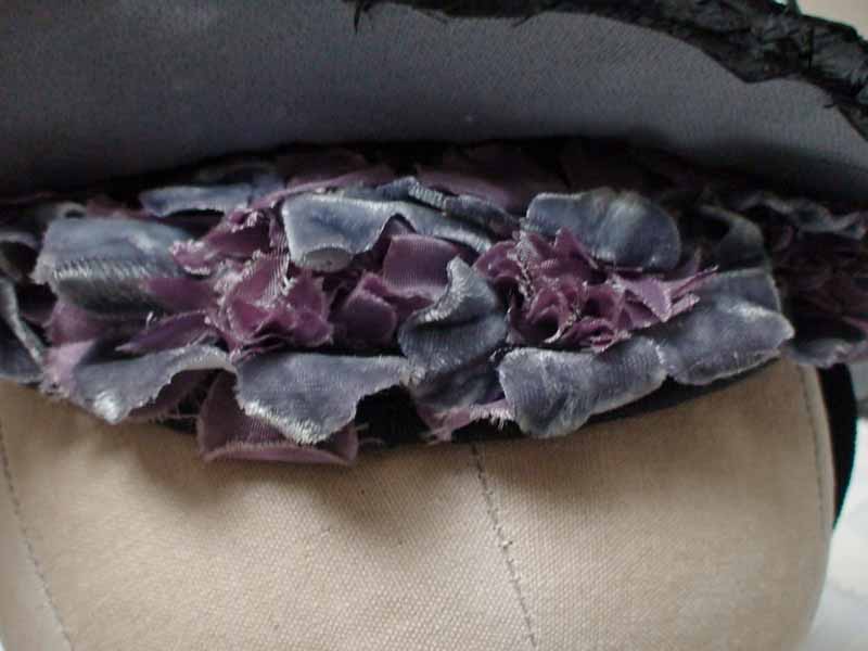 Navy medium brim sailor tilt with porkpie top, pale blue cloth hat band, fabric triangle overhanging hat band on left front, and velvet flowers under the brim in back.
