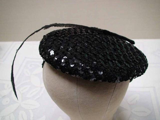 Black sequin close hat with trimmed ostrich feather dotted with sequins