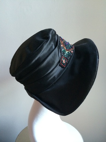Black satin bicorne flat top cloche, with multi-colour glass beading on front
