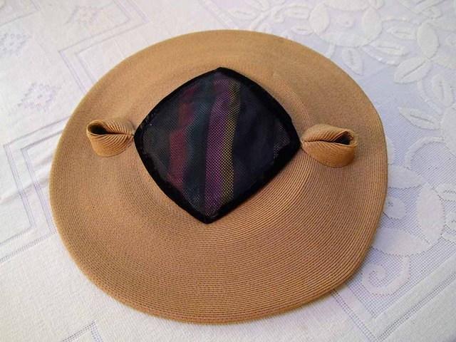 Large ecru fine straw pagoda with open crown exposing multicolor stripe lining coved in black mesh. Odd straw braid formed into conical shapes sit on right and left corners of the diamond shaped opening.
