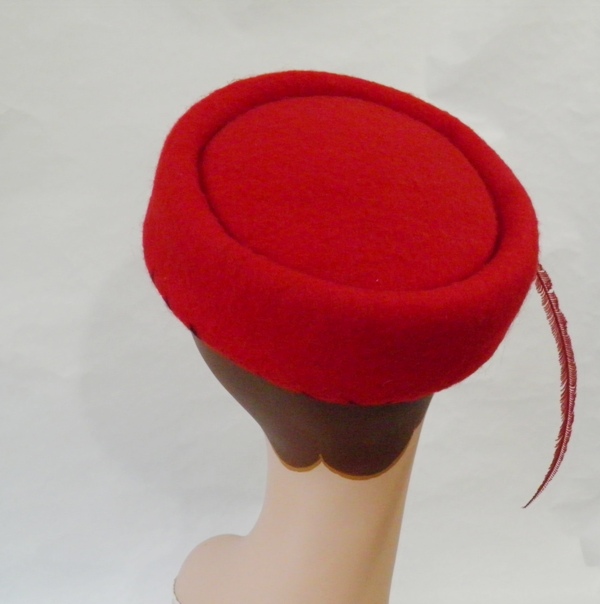 1960s Red felt indented crown toque. Outlined with navy blue blanket stitch. Red feather swoops to the right