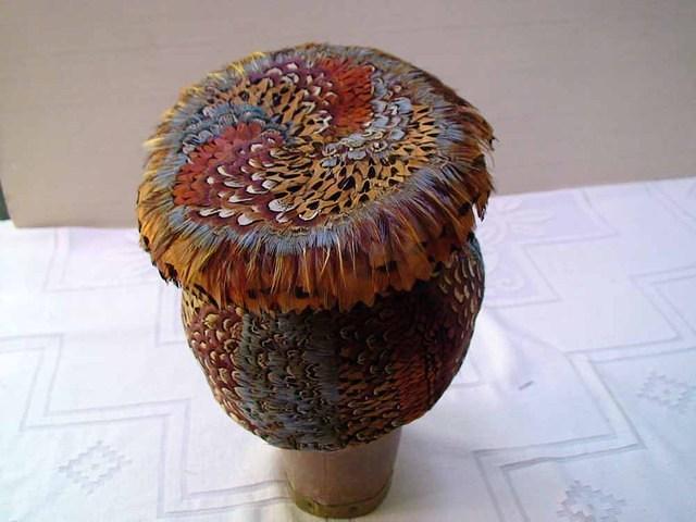 Multi-color pheasant all-over feather African-tribal inspired sculptural toque