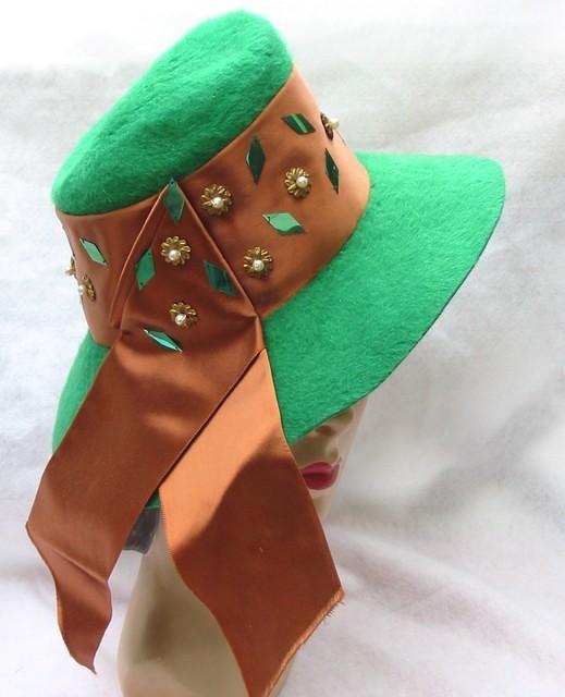 Mid 40’s green fur felt, wide copper satin ribbon around the crown. The ribbon is adorned with faux pearl and brass accents and shiny green plastic "diamond" shaped pieces.