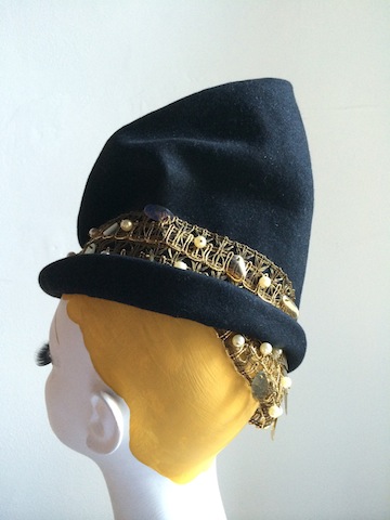 Late 30s sculpted felt Phrygian toque with gold wire trim, pearls and sequins.