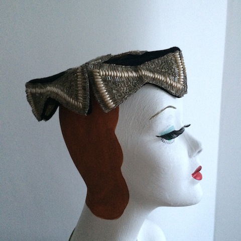 Black open crown pentacorne, embellished with soutache-style beadwork, bugle beads and navette shaped faux pearls. Beaded cross over open crown. Beaded bow shape on each of the five sides, over wired frame.