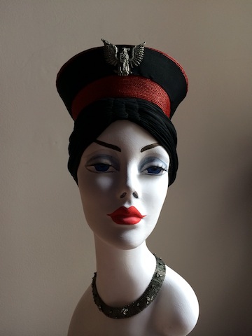 WW2 Shako turban, red straw, black chiffon and grosgrain, and white metal eagle.