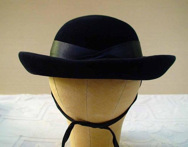 Black shallow crowned Breton with chin strap, satin band and bow in back with dangling ends