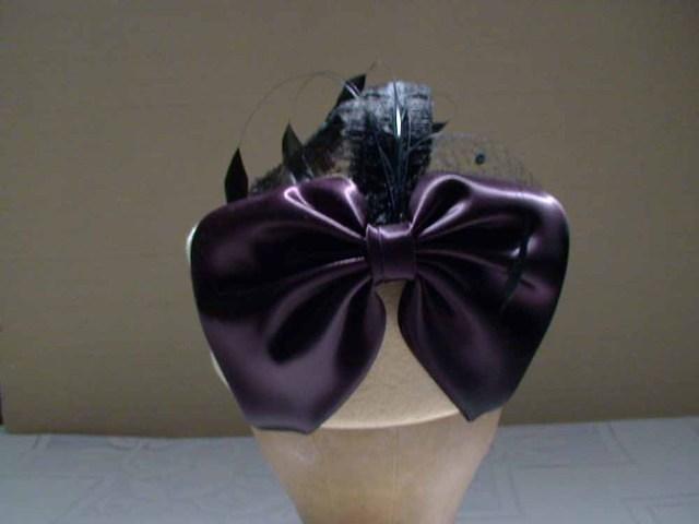 White felt church hat with trimmed ostrich plumes, stripped coq feathers large satin bow in back and chenille dotted veil