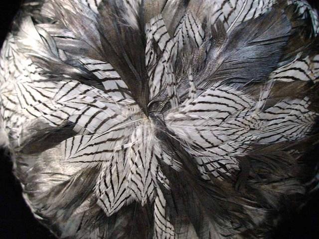 Breton felt church hat with crown and underside of brim covered in partridge and iridescent coq feathers