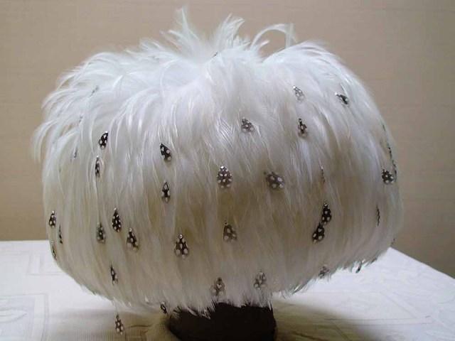 White allover feather bubble toque. Coq feathers are tipped with teardrop shaped cutouts from spotted partridge feathers & tipped with swarovski crystals. The crown is covered with the partridge feathers.