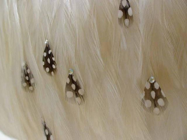 White allover feather bubble toque. Coq feathers are tipped with teardrop shaped cutouts from spotted partridge feathers & tipped with swarovski crystals. The crown is covered with the partridge feathers.