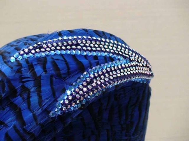 Blue & black all-over Lady Amherst pheasant feather covered cloche with enormous dangling plume. Swarovski crystals & blue glass rhinestones form chevron design. Crystals are sprinkled on the plume as well.
