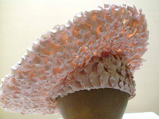 Pink straw profile hat covered with pink silk molded petals, each with 3 Swarovski crystals.
