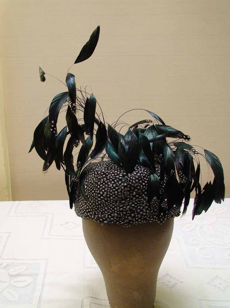Cloche covered with black and white dot feathers, two sprays of long-stemmed iridescent coq feathers stand up from rear and tower over top, tipped in Swarovski crystals.