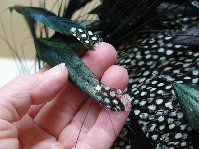 Cloche covered with black and white dot feathers, two sprays of long-stemmed iridescent coq feathers stand up from rear and tower over top, tipped in Swarovski crystals.