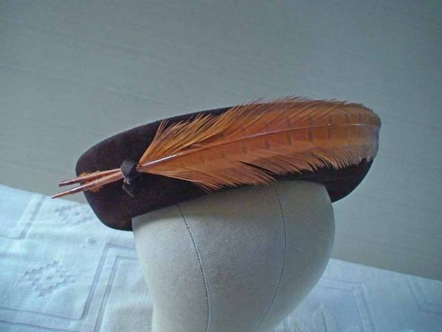 Brown felt Breton with apricot feather wrapped around front of brim.