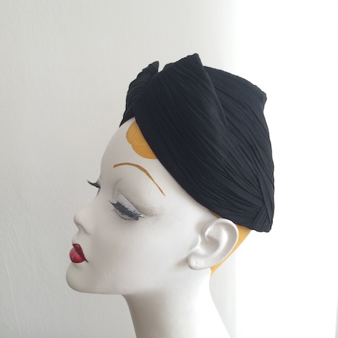 Open crown turban with 'cat ears' in pleated black chiffon