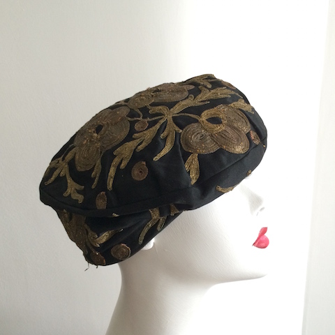 Black silk banded beret with gold soutache embroidery of flowers and leaves