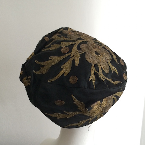 Black silk banded beret with gold soutache embroidery of flowers and leaves